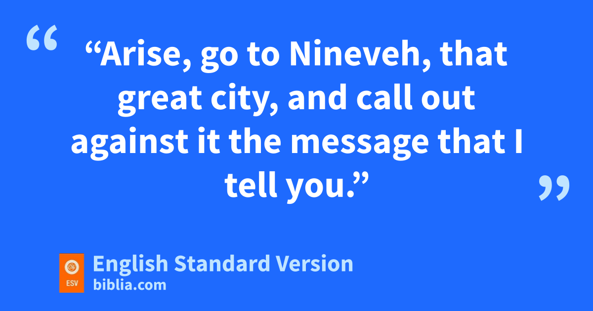 3 Then the word of the Lord came to Jonah the second time, saying, 2 “Arise, go to lNineveh, that great city, and call out against it the message that I tell you.” 3 So Jonah arose and went to Nineveh, according to the word of the Lord. Now lNineveh was an exceedingly great city,1 three days’ journey in breadth.2 4 Jonah began to go into the city, going a day’s journey. And he called out, “Yet forty days, and Nineveh shall be overthrown!” 5 mAnd the people of Nineveh believed God. nThey called for a fast and oput on sackcloth, from the greatest of them to the least of them.