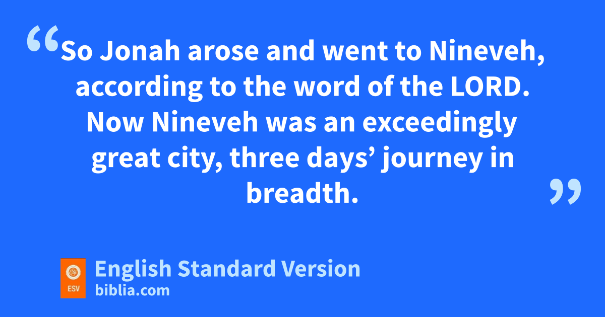 3 Then the word of the Lord came to Jonah the second time, saying, 2 “Arise, go to lNineveh, that great city, and call out against it the message that I tell you.” 3 So Jonah arose and went to Nineveh, according to the word of the Lord. Now lNineveh was an exceedingly great city,1 three days’ journey in breadth.2 4 Jonah began to go into the city, going a day’s journey. And he called out, “Yet forty days, and Nineveh shall be overthrown!” 5 mAnd the people of Nineveh believed God. nThey called for a fast and oput on sackcloth, from the greatest of them to the least of them.