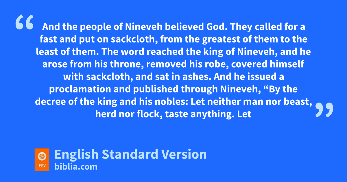 6 The word reached3 the king of Nineveh, and phe arose from his throne, removed his robe, covered himself with sackcloth, qand sat in ashes. 7 And he issued a proclamation and published through Nineveh, r“By the decree of the king and his nobles: Let neither man nor sbeast, herd nor flock, taste anything. Let them not feed or drink water, 8 but let man and sbeast be covered with sackcloth, and let them call out mightily to God. tLet everyone turn from his evil way and from uthe violence that is in his hands. 9 vWho knows? God may turn and relent wand turn from his fierce anger, so that we may not perish.”