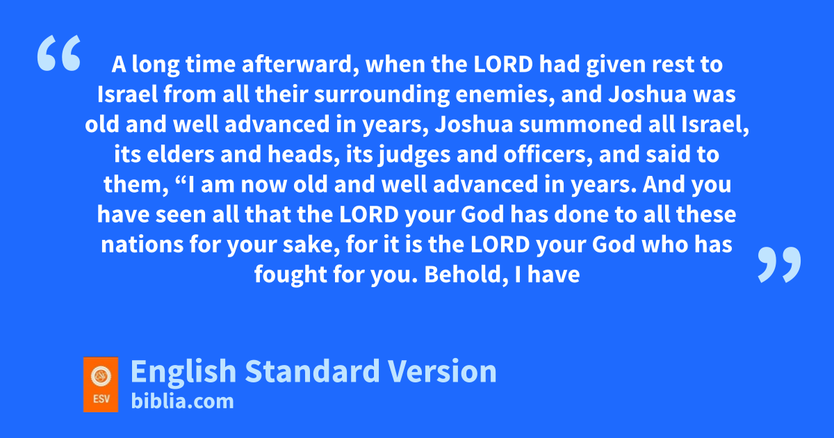 23 A long time afterward, when the Lord had given erest to Israel from all their surrounding enemies, and Joshua fwas old and well advanced in years, 2 Joshua gsummoned all Israel, its elders and heads, its judges and officers, and said to them, “I am now old and well advanced in years. 3 And you have seen all that the Lord your God has done to all these nations for your sake, hfor it is the Lord your God who has fought for you. 4 Behold, iI have allotted to you as an inheritance for your tribes those nations that remain, along with all the nations that I have already cut off, from the Jordan to the Great Sea in the west. 5 The Lord your God jwill push them back before you and drive them out of your sight. And you shall possess their land, kjust as the Lord your God promised you. 6 Therefore, lbe very strong to keep and to do all that is written in the Book of the Law of Moses, mturning aside from it neither to the right hand nor to the left, 7 nthat you may not mix with these nations remaining among you oor make mention of the names of their gods por swear by them or serve them or bow down to them, 8 qbut you shall cling to the Lord your God just as you have done to this day. 9 rFor the Lord has driven out before you great and strong nations. And as for you, sno man has been able to stand before you to this day. 10 tOne man of you puts to flight a thousand, since it is the Lord your God uwho fights for you, just as he promised you. 11 vBe very careful, therefore, to love the Lord your God. 12 For if you turn back and cling to the remnant of these nations remaining among you wand make marriages with them, so that you associate with them and they with you, 13 know for certain that xthe Lord your God will no longer drive out these nations before you, ybut they shall be a snare and a trap for you, a whip on your sides and thorns in your eyes, until you perish from off this good ground that the Lord your God has given you.