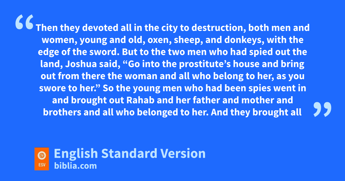 15 On the seventh day they rose early, at the dawn of day, and marched around the city in the same manner seven times. It was only on that day that they marched around the city seven times. 16 And at the seventh time, when the priests had blown the trumpets, Joshua said to the people, “Shout, for the Lord has given you the city. 17 And the city and all that is within it shall be ndevoted to the Lord for destruction.2 Only Rahab the prostitute and all who are with her in her house shall live, because she ohid the messengers whom we sent. 18 But you, keep yourselves from the things devoted to destruction, lest when you have devoted them you take any of the devoted things and make the camp of Israel pa thing for destruction and qbring trouble upon it. 19 But all silver and gold, and every vessel of bronze and iron, are holy to the Lord; they shall go into the treasury of the Lord.” 20 So the people shouted, and the trumpets were blown. As soon as the people heard the sound of the trumpet, the people shouted a great shout, and rthe wall fell down flat, so that the people went up into the city, every man straight before him, and they captured the city. 21 Then they sdevoted all in the city to destruction, both men and women, young and old, oxen, sheep, and donkeys, with the edge of the sword.