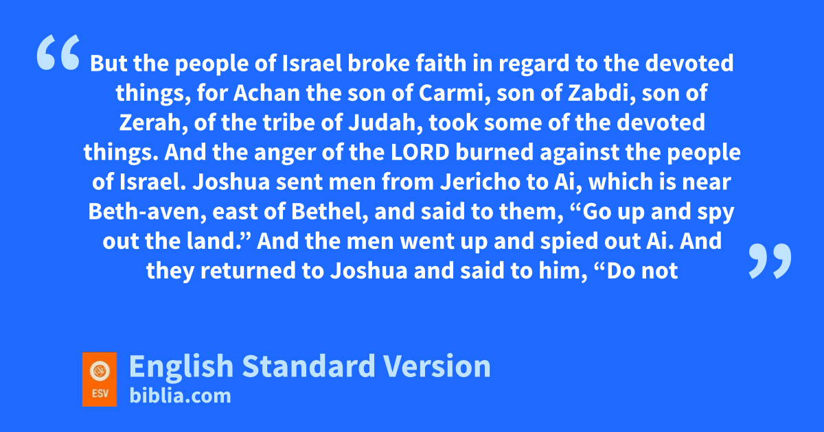 7 But the people of Israel broke faith in regard to the devoted things, for aAchan the son of Carmi, son of Zabdi, son of Zerah, of the tribe of Judah, took some of the devoted things. And the anger of the Lord burned against the people of Israel.