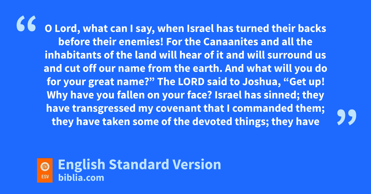 10 The Lord said to Joshua, “Get up! Why have you fallen on your face? 11 Israel has sinned; they have jtransgressed my covenant that I commanded them; they have taken some of the kdevoted things; they have stolen and lied and put them among their own belongings. 12 lTherefore the people of Israel cannot stand before their enemies. They mturn their backs before their enemies, because they have become ndevoted for destruction.1 I will be with you no more, unless you destroy othe devoted things from among you. 13 Get up! Consecrate the people and say, p‘Consecrate yourselves for tomorrow; for thus says the Lord, God of Israel, “There are devoted things in your midst, O Israel. You cannot stand before your enemies until you take away the devoted things from among you.” 14 In the morning therefore you shall be brought near qby your tribes. And the tribe that the Lord takes by lot shall come near by clans. And the clan that the Lord takes shall come near by households. And the household that the Lord takes shall come near man by man. 15 rAnd he who is taken with the devoted things shall be burned with fire, he and all that he has, because he has stransgressed the covenant of the Lord, and because he has done tan outrageous thing in Israel.’ ”