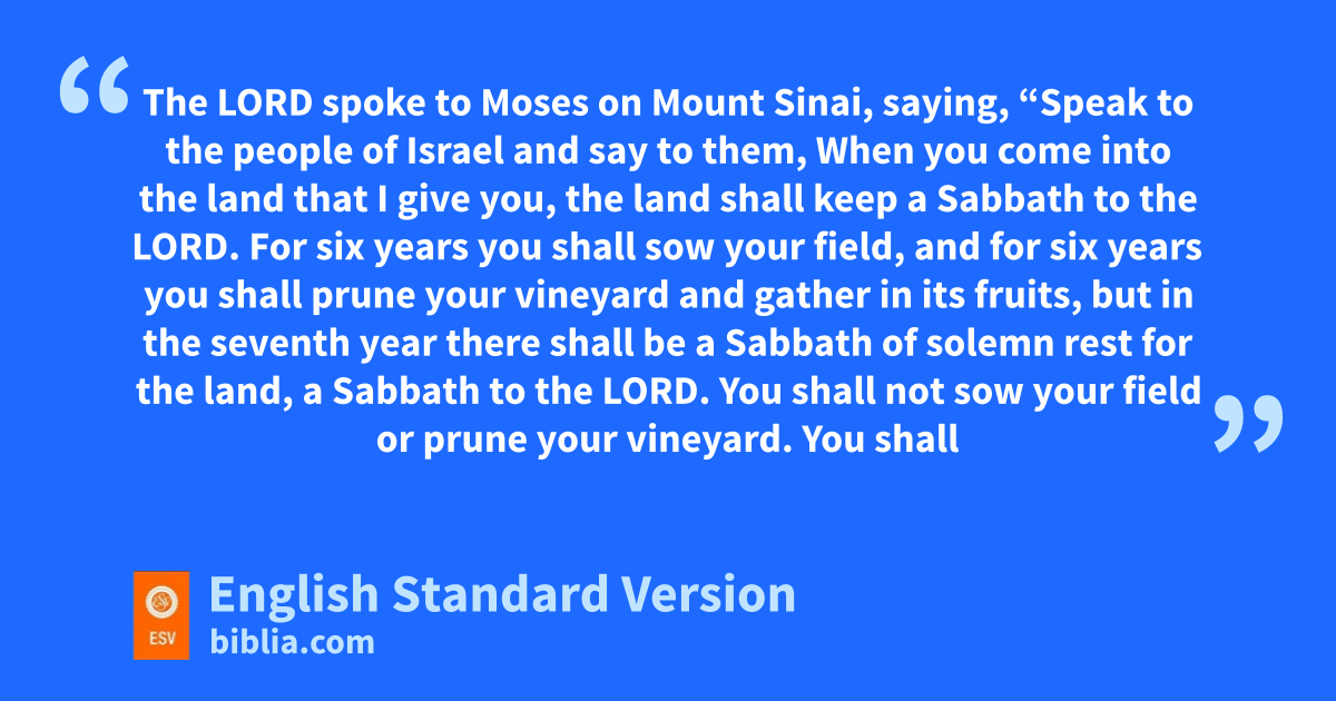 25 wThe Lord spoke to Moses on Mount Sinai, saying, 2 “Speak to the people of Israel and say to them, When you come into xthe land that I give you, the land shall keep a Sabbath to the Lord. 3 For six years you shall sow your field, and for six years you shall prune your vineyard and gather in its fruits, 4 but in the seventh year there shall be a Sabbath of solemn rest for the land, a Sabbath to the Lord. You shall not sow your field or prune your vineyard. 5 yYou shall not reap what grows of itself in your harvest, or gather the grapes of your undressed vine. It shall be a year of solemn rest for the land. 6 The Sabbath of the land1 shall provide food for you, for yourself and for your male and female slaves2 and for your hired worker and the sojourner who lives with you, 7 and for your cattle and for the wild animals that are in your land: zall its yield shall be for food.