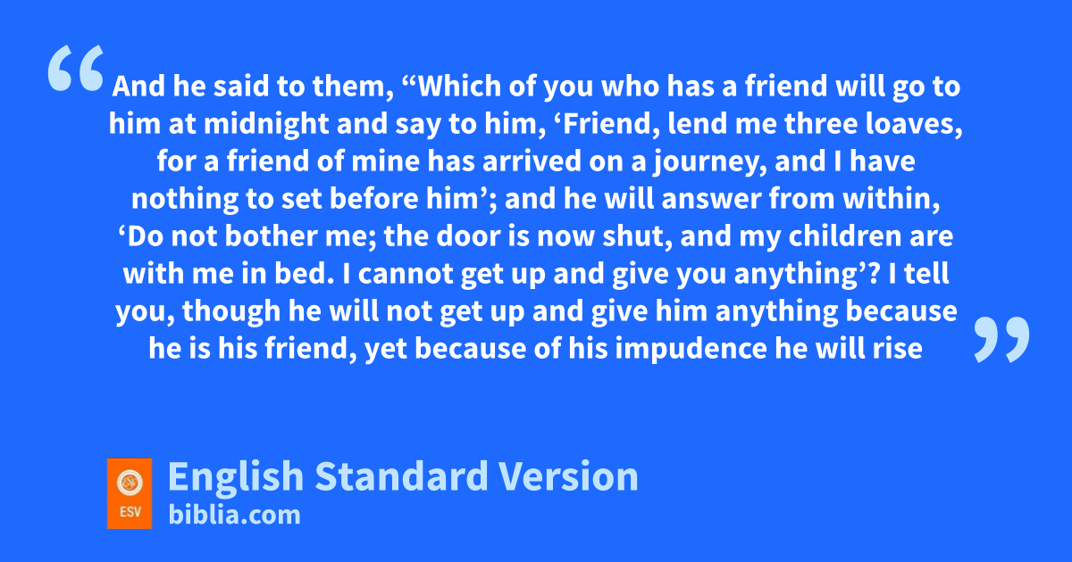 5 And he said to them, “Which of you who has a friend will go to him at midnight and say to him, ‘Friend, lend me three loaves, 6 for a friend of mine has arrived on a journey, and I have nothing to set before him’; 7 and he will answer from within, ‘Do not bother me; the door is now shut, and my children are with me in bed. I cannot get up and give you anything’? 8 I tell you, though he will not get up and give him anything qbecause he is his friend, yet because of his impudence3 he will rise and give him whatever he needs. 9 And I tell you, rask, and sit will be given to you; tseek, and you will find; uknock, and it will be opened to you. 10 For everyone who asks receives, and the one who seeks finds, and to the one who knocks it will be opened. 11 What father among you, if his son asks for4 a fish, will instead of a fish give him a serpent; 12 or if he asks for an egg, will give him a scorpion? 13 If you then, wwho are evil, know how to give good gifts to your children, how much more will the heavenly Father xgive the Holy Spirit to those who ask him!”
