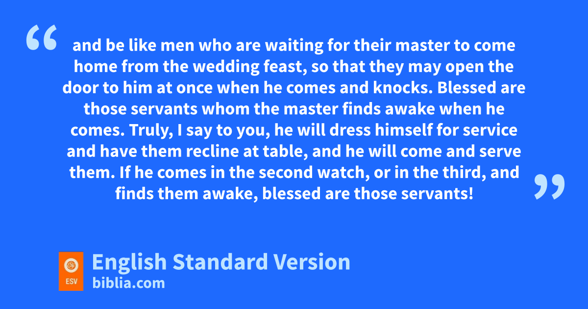 35 a“Stay dressed for action5 and bkeep your lamps burning, 36 and be like men who are cwaiting for their master to come home from the wedding feast, so that they may open the door to him at once when he comes and dknocks. 37 eBlessed are those servants6 whom the master finds eawake when he comes. Truly, I say to you, fhe will dress himself for service and ghave them recline at table, and he will come and serve them. 38 If he comes in the second watch, or in the third, and finds them awake, blessed are those servants! 39 hBut know this, that if the master of the house had known at what hour ithe thief was coming, he7 would not have left his house to be broken into. 40 You also must be jready, for kthe Son of Man is coming at an hour you do not expect.”