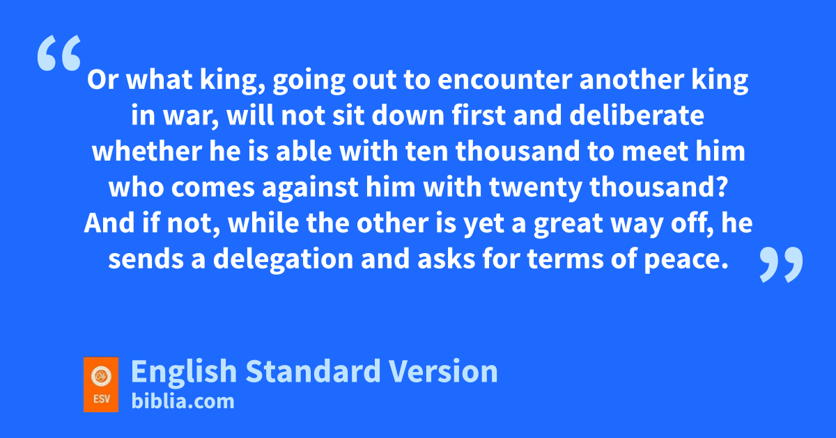 25 Now great crowds accompanied him, and he turned and said to them, 26 n“If anyone comes to me and odoes not hate his own father and mother and wife and children and brothers and sisters, pyes, and even his own life, he cannot be my disciple. 27 qWhoever does not rbear his own cross and come after me cannot be my disciple. 28 For which of you, desiring to build a tower, does not sfirst sit down and count the cost, whether he has enough to complete it? 29 Otherwise, when he has laid a foundation and is not able to finish, all who see it begin to mock him, 30 saying, ‘This man began to build and was not able to finish.’ 31 Or what king, going out to encounter another king in war, will not tsit down first and deliberate whether he is able with ten thousand to meet him who comes against him with twenty thousand? 32 And if not, while the other is yet a great way off, he sends a delegation and asks for terms of peace. 33 uSo therefore, any one of you who vdoes not renounce all that he has cannot be my disciple.