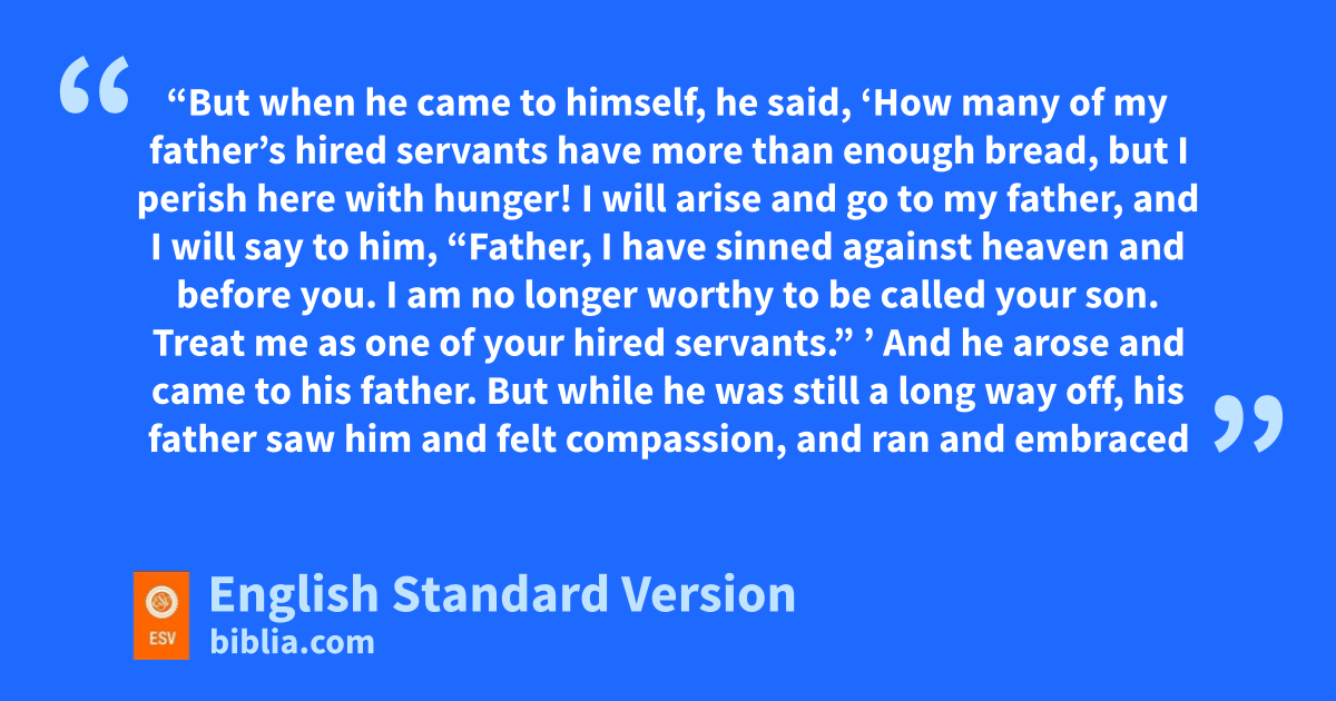 17 “But qwhen he rcame to himself, he said, ‘How many of my father’s hired servants have more than enough bread, but I perish here with hunger! 18 I will arise and go to my father, and I will say to him, “Father, sI have sinned against theaven and before you. 19 uI am no longer worthy to be called your son. Treat me as one of your hired servants.” ’ 20 And he arose and came to his father. But while he was still a long way off, his father saw him and felt compassion, and vran and wembraced him and xkissed him. 21 And the son said to him, ‘Father, I have sinned against heaven and before you. uI am no longer worthy to be called your son.’3 22 But the father said to his servants,4 ‘Bring quickly ythe best robe, and put it on him, and put za ring on his hand, and ashoes on his feet. 23 And bring bthe fattened calf and kill it, and clet us eat and celebrate. 24 For this my son dwas dead, and is alive again; he was lost, and is found.’ And they began to celebrate.