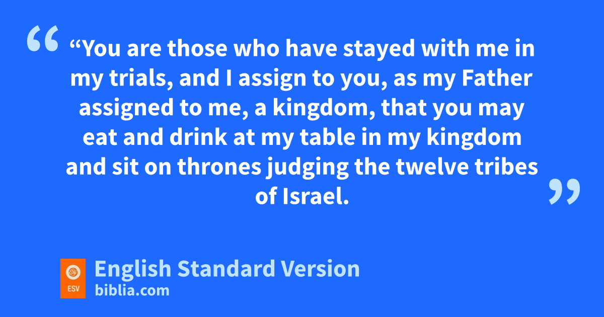 28 “You are those who have stayed with me win my trials, 29 and xI assign to you, as my Father assigned to me, a kingdom, 30 ythat you may eat and drink at my table in my kingdom and zsit on thrones judging athe twelve tribes of Israel.