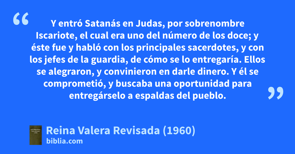3Y entró Satanás en Judas, por sobrenombre Iscariote, el cual era uno del número de los doce; 4y éste fue y habló con los principales sacerdotes, y con los jefes de la guardia, de cómo se lo entregaría. 5Ellos se alegraron, y convinieron en darle dinero. 6Y él se comprometió, y buscaba una oportunidad para entregárselo a espaldas del pueblo.