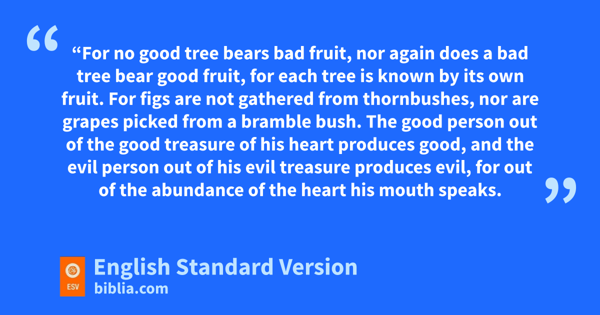 43 “For rno good tree bears bad fruit, nor again does a bad tree bear good fruit, 44 for seach tree is known by its own fruit. For figs are not gathered from thornbushes, nor are grapes picked from a bramble bush. 45 tThe good person out of the good treasure of his heart produces good, and the evil person out of his evil treasure produces uevil, vfor out of the abundance of the heart his mouth speaks.