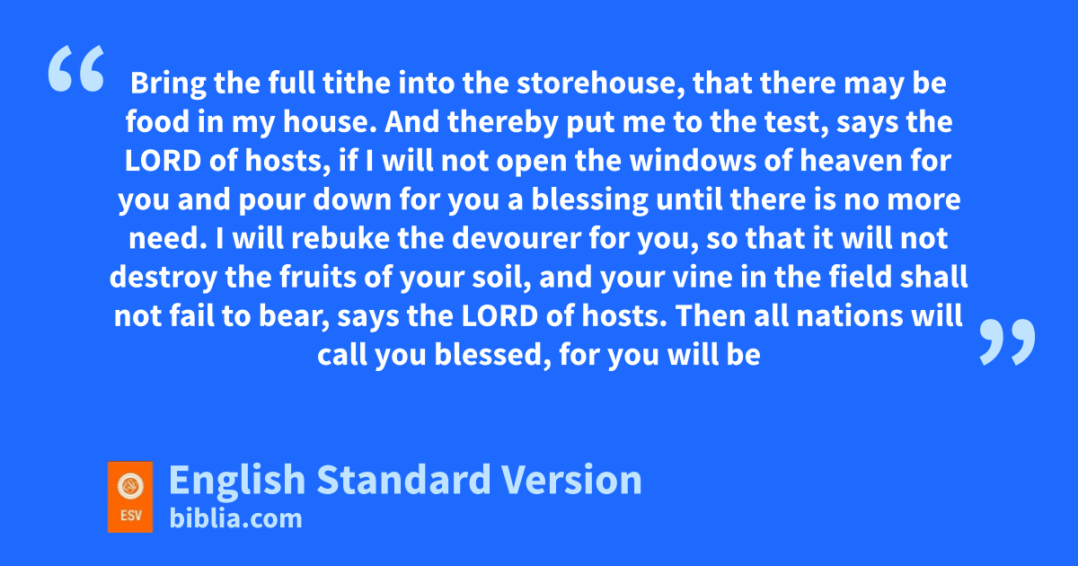 6 “For tI the Lord do not change; utherefore you, O children of Jacob, are not consumed. 7 vFrom the days of your fathers you have turned aside from my statutes and have not kept them. wReturn to me, and I will return to you, says the Lord of hosts. xBut you say, ‘How shall we return?’ 8 Will man rob God? Yet you are robbing me. xBut you say, ‘How have we robbed you?’ yIn your tithes and contributions. 9 zYou are cursed with a curse, for you are robbing me, the whole nation of you. 10 aBring the full tithe into the storehouse, that there may be food in my house. And thereby bput me to the test, says the Lord of hosts, if I will not open cthe windows of heaven for you and pour down for you a blessing until there is no more need. 11 I will rebuke dthe devourer2 for you, so that it will not destroy the fruits of your soil, and your vine in the field shall not fail to bear, says the Lord of hosts. 12 Then eall nations will call you blessed, for you will be fa land of delight, says the Lord of hosts.
