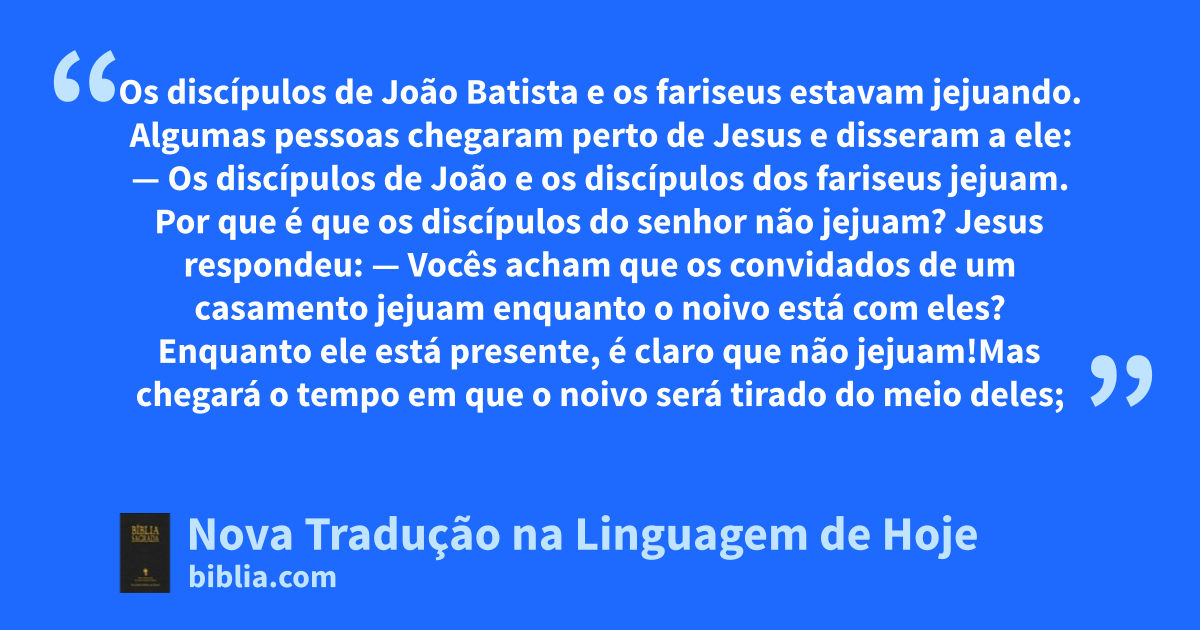 — Vocês acham que os convidados de um casamento jejuam enquanto o noivo está com eles? Enquanto ele está presente, é claro que não jejuam!20 Mas chegará o tempo em que o noivo será tirado do meio deles; então sim eles vão jejuar!