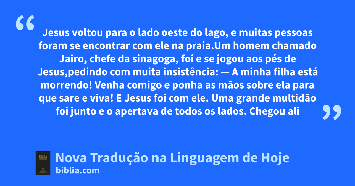 21 Jesus voltou para o lado oeste do lago, e muitas pessoas foram se encontrar com ele na praia.22 Um homem chamado Jairo, chefe da * sinagoga, foi e se jogou aos pés de Jesus,23 pedindo com muita insistência: