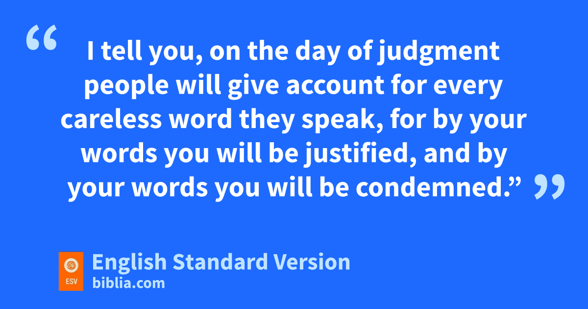 33 n“Either make the tree good and its fruit good, or make the tree bad and its fruit bad, ofor the tree is known by its fruit. 34 pYou brood of vipers! How can you speak good, qwhen you are evil? rFor out of the abundance of the heart the mouth speaks. 35 rThe good person out of his good treasure brings forth good, and the evil person out of his evil treasure brings forth evil. 36 I tell you, son the day of judgment tpeople will give account for uevery careless word they speak, 37 for vby your words you will be justified, and by your words you will be condemned.”