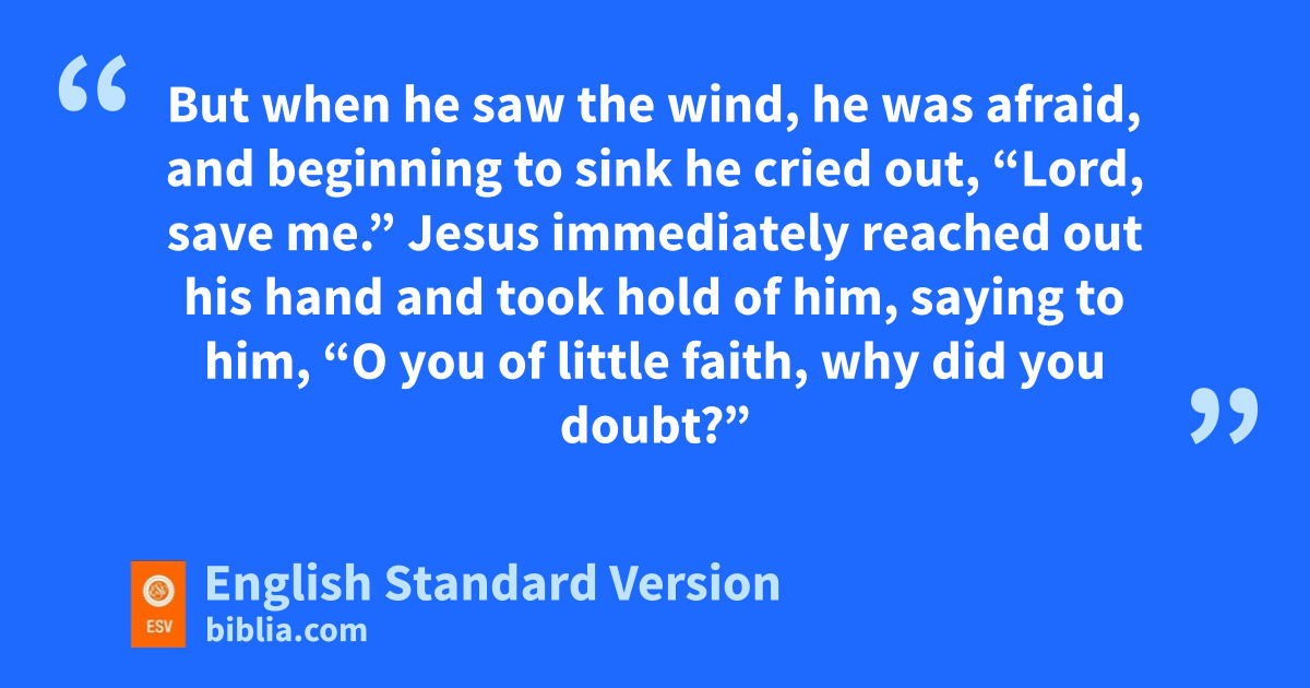 28 And Peter answered him, “Lord, if it is you, command me to come to you on the water.” 29 He said, “Come.” So Peter got out of the boat and rwalked on the water and came to Jesus. 30 But when he saw the wind,5 he was afraid, and beginning to sink he cried out, s“Lord, save me.” 31 Jesus immediately reached out his hand and took hold of him, saying to him, t“O you of little faith, why did you udoubt?” 32 And when they got into the boat, sthe wind ceased. 33 And vthose in the boat wworshiped him, saying, x“Truly you are ythe Son of God.”