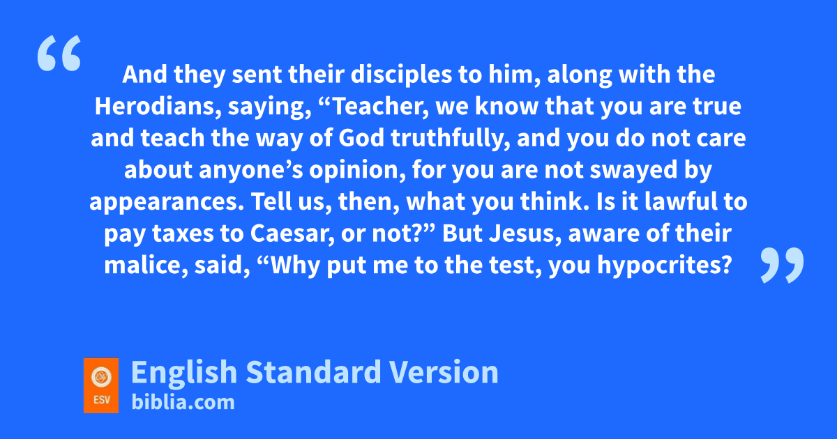 15 gThen the Pharisees went and plotted how hto entangle him in his words. 16 And they sent itheir disciples to him, along with jthe Herodians, saying, “Teacher, kwe know that you are true and teach lthe way of God truthfully, and you do not care about anyone’s opinion, for myou are not swayed by appearances.2 17 Tell us, then, what you think. Is it lawful to pay ntaxes to oCaesar, or not?” 18 But Jesus, aware of their malice, said, “Why pput me to the test, you hypocrites? 19 Show me the coin for the tax.” And they brought him a denarius.3 20 And Jesus said to them, “Whose likeness and inscription is this?” 21 They said, “Caesar’s.” Then he said to them, q“Therefore render to Caesar the things that are Caesar’s, and to God the things that are God’s.” 22 When they heard it, they marveled. And they rleft him and went away.