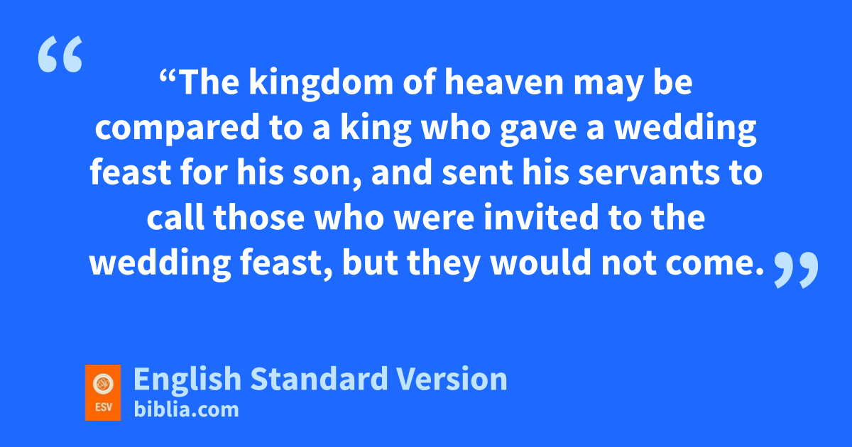 22 And again Jesus ospoke to them in parables, saying, 2 p“The kingdom of heaven may be compared to a king who gave qa wedding feast for his son, 3 and rsent his servants1 to call those who were invited to the wedding feast, but they would not come. 4 sAgain he sent other servants, saying, ‘Tell those who are invited, “See, I have prepared my tdinner, umy oxen and my fat calves have been slaughtered, and everything is ready. Come to the wedding feast.” ’ 5 But vthey paid no attention and went off, one to his farm, another to his business, 6 while the rest seized his servants, wtreated them shamefully, and xkilled them. 7 The king was angry, and he sent his troops and ydestroyed those murderers and burned their city. 8 Then he said to his servants, ‘The wedding feast is ready, but those invited were not zworthy. 9 Go therefore to the main roads and invite to the wedding feast as many as you find.’ 10 And those servants went out into the roads and bgathered all whom they found, both bad and good. So the wedding hall was filled with guests.