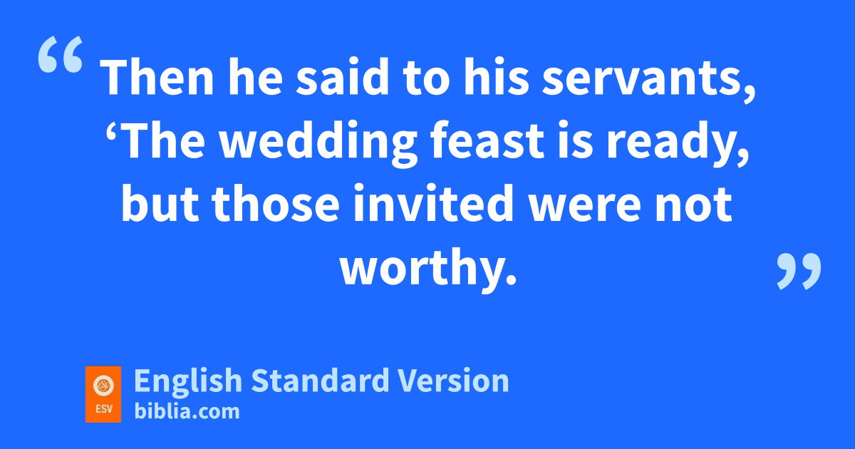 22 And again Jesus ospoke to them in parables, saying, 2 p“The kingdom of heaven may be compared to a king who gave qa wedding feast for his son, 3 and rsent his servants1 to call those who were invited to the wedding feast, but they would not come. 4 sAgain he sent other servants, saying, ‘Tell those who are invited, “See, I have prepared my tdinner, umy oxen and my fat calves have been slaughtered, and everything is ready. Come to the wedding feast.” ’ 5 But vthey paid no attention and went off, one to his farm, another to his business, 6 while the rest seized his servants, wtreated them shamefully, and xkilled them. 7 The king was angry, and he sent his troops and ydestroyed those murderers and burned their city. 8 Then he said to his servants, ‘The wedding feast is ready, but those invited were not zworthy. 9 Go therefore to the main roads and invite to the wedding feast as many as you find.’ 10 And those servants went out into the roads and bgathered all whom they found, both bad and good. So the wedding hall was filled with guests.