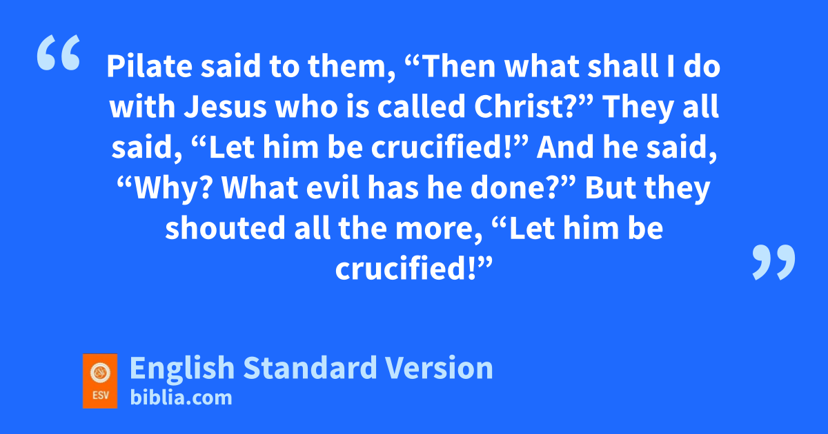 15 qNow at the feast the governor was accustomed to release for the crowd any one prisoner whom they wanted. 16 And they had then a notorious prisoner called Barabbas. 17 So when they had gathered, Pilate said to them, “Whom do you want me to release for you: Barabbas, or rJesus who is called Christ?” 18 For he knew that it was out sof envy that they had delivered him up. 19 Besides, while he was sitting on tthe judgment seat, his wife sent word to him, “Have nothing to do with uthat righteous man, for I have suffered much because of him today vin a dream.” 20 Now the chief priests and the elders persuaded the crowd to wask for Barabbas and destroy Jesus. 21 The governor again said to them, “Which of the two do you want me to release for you?” And they said, “Barabbas.” 22 Pilate said to them, “Then what shall I do with Jesus who is called Christ?” xThey all said, “Let him be crucified!” 23 And he said, “Why? yWhat evil has he done?” But they shouted all the more, “Let him be crucified!”