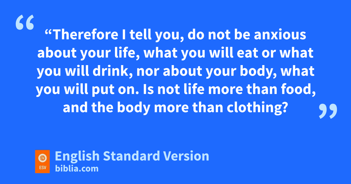 25 e“Therefore I tell you, fdo not be anxious about your life, what you will eat or what you will drink, nor about your body, what you will put on. Is not life more than food, and the body more than clothing? 26 gLook at the birds of the air: they neither sow nor reap nor gather into barns, and yet your heavenly Father feeds them. hAre you not of more value than they? 27 And which of you by being anxious can add a single hour to his ispan of life?7 28 And why are you anxious about clothing? Consider the lilies of the field, how they grow: they neither toil nor spin, 29 yet I tell you, jeven Solomon in all his glory was not arrayed like one of these. 30 But if God so clothes the grass of the field, which today is alive and tomorrow is thrown into the oven, will he not much more clothe you, kO you of little faith? 31 Therefore do not be anxious, saying, ‘What shall we eat?’ or ‘What shall we drink?’ or ‘What shall we wear?’ 32 For lthe Gentiles seek after all these things, and myour heavenly Father knows that you need them all. 33 But nseek first othe kingdom of God and his righteousness, pand all these things will be added to you.
