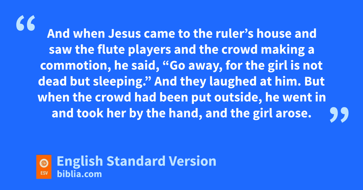 18 tWhile he was saying these things to them, behold, a ruler came in and uknelt before him, saying, “My daughter has just died, but come and lay your hand on her, and she will live.” 19 And Jesus rose and followed him, with his disciples. 20 And behold, a woman vwho had suffered from a discharge of blood for twelve years came up behind him and touched wthe fringe of his garment, 21 for she said to herself, “If I only touch his garment, I will be made well.” 22 Jesus turned, and seeing her he said, x“Take heart, daughter; your faith has made you well.” yAnd instantly4 the woman was made well. 23 And when Jesus came to the ruler’s house and saw zthe flute players and the crowd making a commotion, 24 he said, “Go away, for athe girl is not dead but bsleeping.” And they laughed at him. 25 But cwhen the crowd had been put outside, he went in and dtook her by the hand, and the girl arose. 26 And the report of this went through all that district.