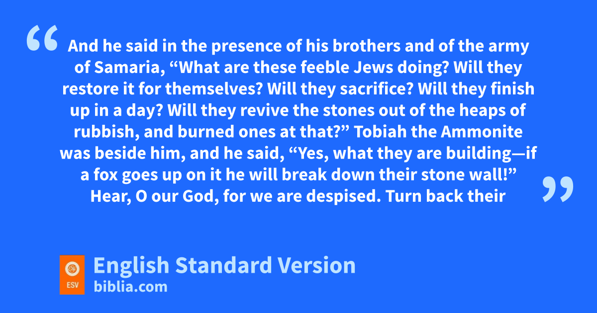 4 1 Now when qSanballat heard that we were building the wall, he was angry and greatly enraged, and he jeered at the Jews. 2 And he said in the presence of his brothers and of the army of rSamaria, “What are these feeble Jews doing? Will they restore it for themselves?2 Will they sacrifice? Will they finish up in a day? Will they revive the stones out of the heaps of rubbish, and burned ones at that?” 3 qTobiah the Ammonite was beside him, and he said, “Yes, what they are building—sif a fox goes up on it he will break down their stone wall!” 4 tHear, O our God, for we are despised. uTurn back their taunt on their own heads and give them up to be plundered in a land where they are captives. 5 vDo not cover their guilt, and let not their sin be blotted out from your sight, for they have provoked you to anger in the presence of the builders.