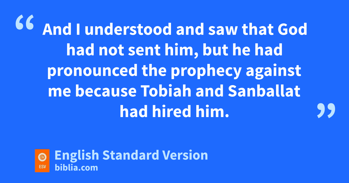 10 Now when I went into the house of Shemaiah the son of Delaiah, son of Mehetabel, who was fconfined to his home, he said, “Let us meet together in the house of God, within the temple. Let us close the doors of the temple, for they are coming to kill you. They are coming to kill you by night.” 11 But I said, “Should such a man as I run away? And what man such as I could go into the temple and live?3 I will not go in.” 12 And I understood and saw that God had not sent him, gbut he had pronounced the prophecy against me because Tobiah and Sanballat had hired him. 13 For this purpose he was hired, that I should be afraid and act in this way and sin, and so they could give me a bad name in order to taunt me. 14 hRemember Tobiah and Sanballat, O my God, according to these things that they did, and also ithe prophetess Noadiah and the rest of the prophets who wanted to make me afraid.