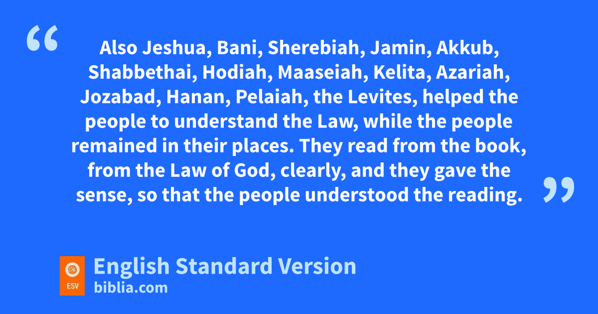 8 And all the people gathered as one man into the square before tthe Water Gate. And they told uEzra the scribe to bring the Book of the Law of Moses that the Lord had commanded Israel. 2 So Ezra the priest vbrought the Law before the assembly, both men and women and all who could understand what they heard, won the first day of the seventh month. 3 xAnd he read from it facing the square before the Water Gate from early morning until midday, in the presence of the men and the women and those who could understand. And the ears of all the people were attentive to the Book of the Law. 4 And Ezra the scribe stood on a wooden platform that they had made for the purpose. And beside him stood Mattithiah, Shema, Anaiah, Uriah, Hilkiah, and Maaseiah on his right hand, and Pedaiah, Mishael, Malchijah, Hashum, Hashbaddanah, Zechariah, and Meshullam on his left hand. 5 And Ezra opened the book in the sight of all the people, for he was above all the people, and as he opened it all the people stood. 6 And Ezra blessed the Lord, the great God, and all the people answered, y“Amen, Amen,” zlifting up their hands. aAnd they bowed their heads and worshiped the Lord with their faces to the ground. 7 bAlso Jeshua, Bani, Sherebiah, Jamin, Akkub, Shabbethai, Hodiah, Maaseiah, Kelita, Azariah, Jozabad, Hanan, Pelaiah, the Levites,1 chelped the people to understand the Law, dwhile the people remained in their places. 8 They read from the book, from the Law of God, clearly,2 and they gave the sense, so that the people understood the reading.