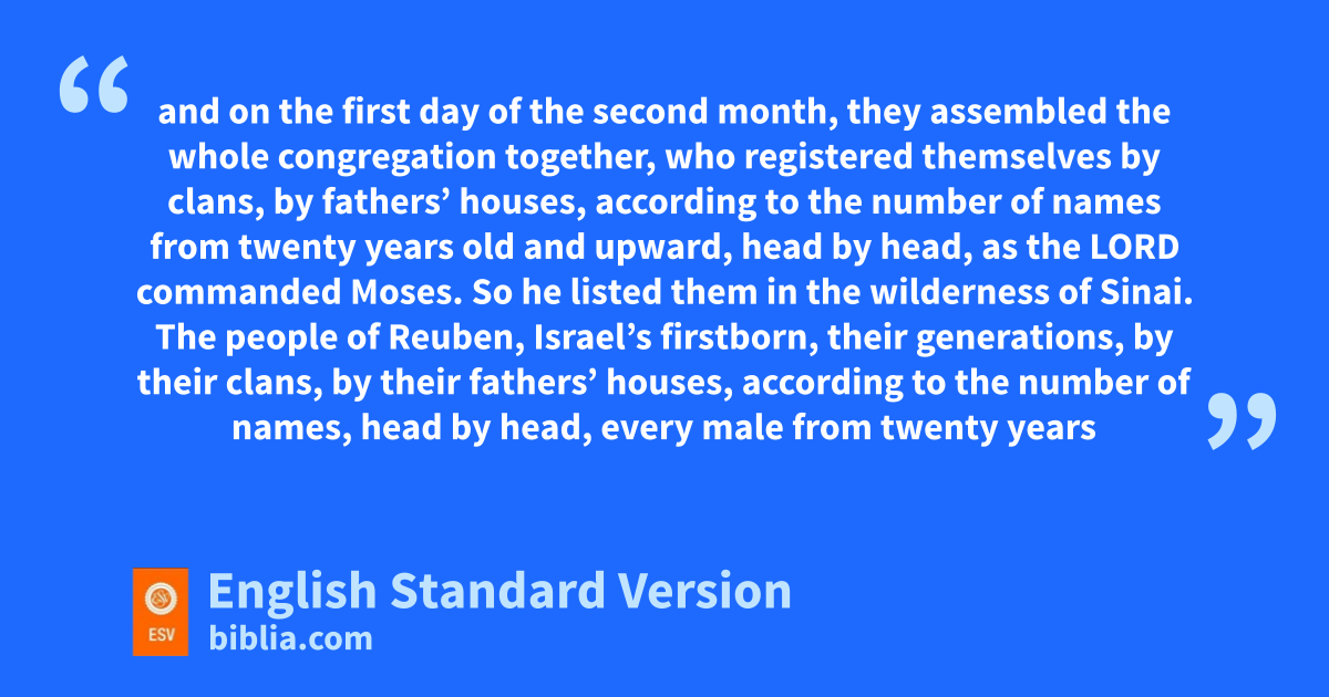 17 Moses and Aaron took these men uwho had been named, 18 and on the first day of the second month, they assembled the whole congregation together, who registered themselves by clans, by fathers’ houses, according to the number of names from twenty years old and upward, head by head, 19 as the Lord commanded Moses. So he listed them in the wilderness of Sinai.