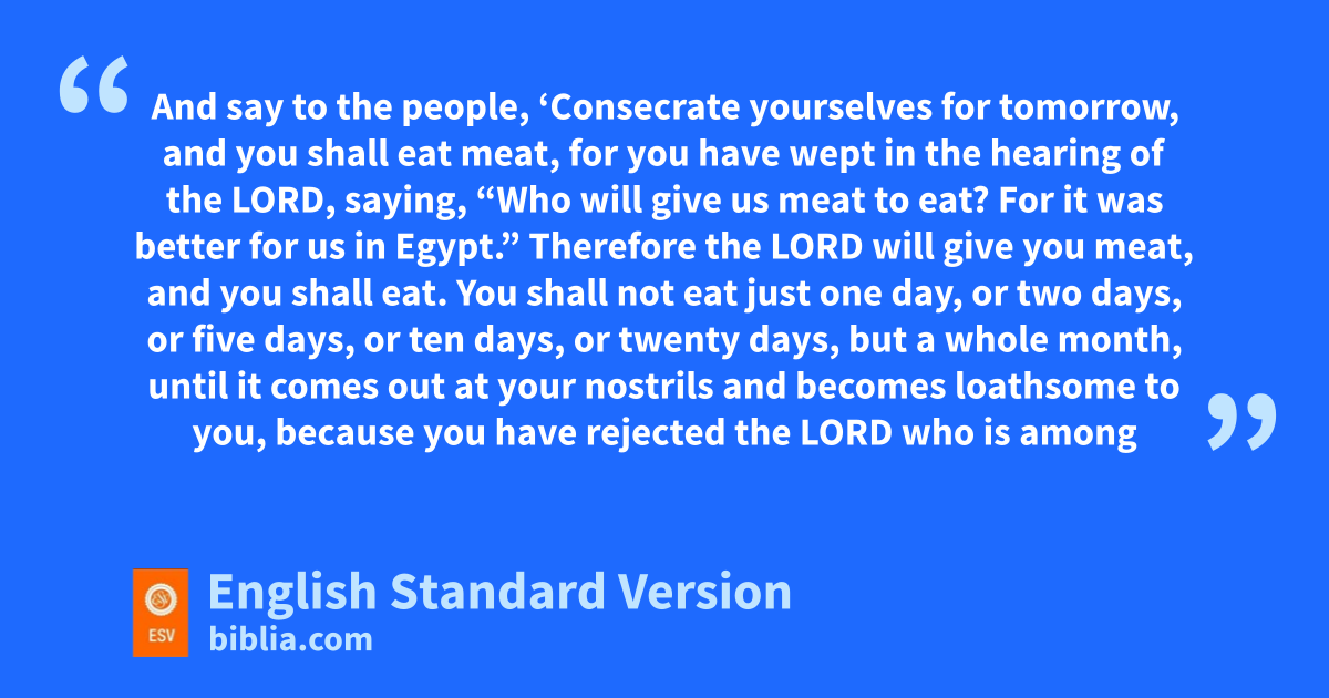 16 Then the Lord said to Moses, “Gather for me oseventy men of the elders of Israel, whom you know to be the elders of the people and pofficers over them, and bring them to the tent of meeting, and let them take their stand there with you. 17 qAnd I will come down and talk with you there. And rI will take some of the Spirit that is on you and put it on them, and sthey shall bear the burden of the people with you, so that you may not bear it yourself alone. 18 And say to the people, t‘Consecrate yourselves for tomorrow, and you shall eat meat, for you have wept in the hearing of the Lord, saying, “Who will give us meat to eat? uFor it was better for us in Egypt.” Therefore the Lord will give you meat, and you shall eat. 19 You shall not eat just one day, or two days, or five days, or ten days, or twenty days, 20 but a whole month, vuntil it comes out at your nostrils and becomes loathsome to you, because you have rejected the Lord who is among you and have wept before him, saying, w“Why did we come out of Egypt?” ’ ” 21 But Moses said, x“The people among whom I am number six hundred thousand on foot, and you have said, ‘I will give them meat, that they may eat a whole month!’ 22 yShall flocks and herds be slaughtered for them, and be enough for them? Or shall all the fish of the sea be gathered together for them, and be enough for them?” 23 And the Lord said to Moses, z“Is the Lord’s hand shortened? Now you shall see whether amy word will come true for you or not.”