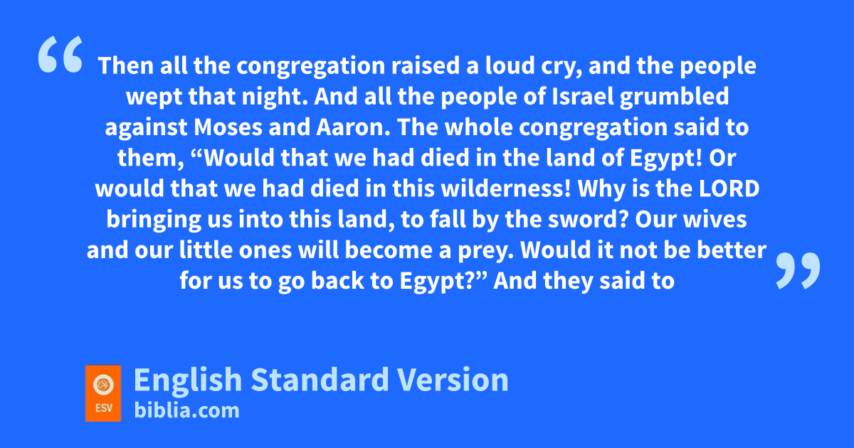14 Then all the congregation raised a loud cry, and the people iwept that night. 2 And all the people of Israel jgrumbled against Moses and Aaron. The whole congregation said to them, “Would that we had died in the land of Egypt! Or kwould that we had died in this wilderness! 3 Why is the Lord bringing us into this land, to fall by the sword? lOur wives and our little ones will become a prey. Would it not be better for us to go back to Egypt?” 4 And they said to one another, m“Let us choose a leader and ngo back to Egypt.”