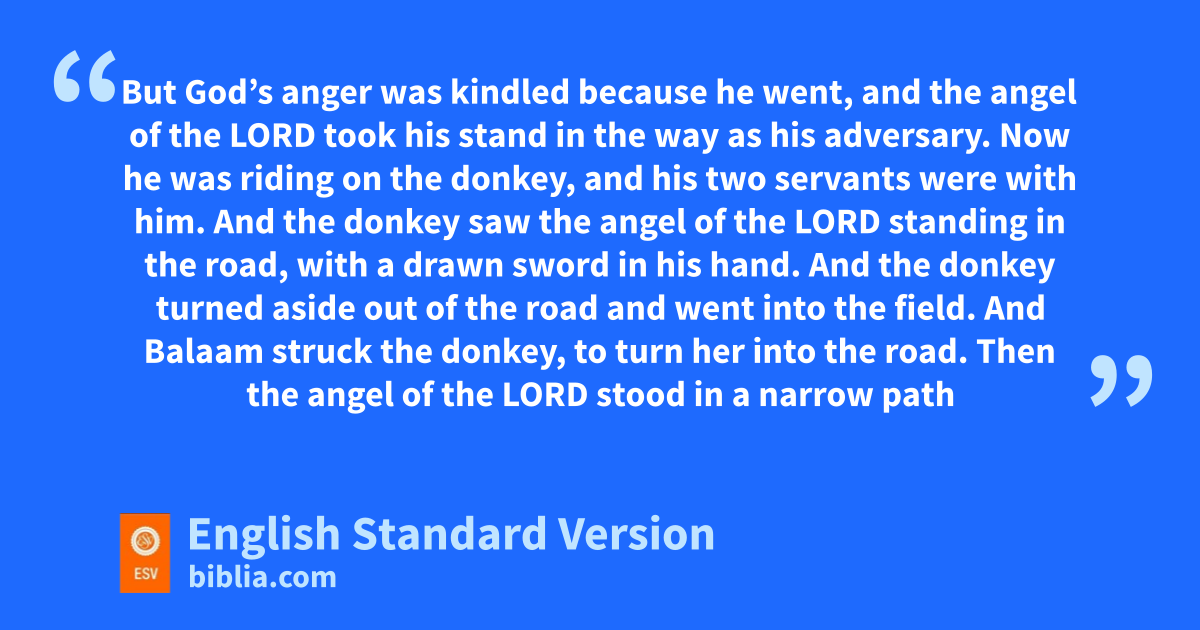 22 But God’s anger was kindled because he went, yand the angel of the Lord took his stand in the way zas his adversary. Now he was riding on the donkey, and his two servants were with him. 23 And the donkey saw the angel of the Lord standing in the road, with a drawn sword in his hand. And the donkey turned aside out of the road and went into the field. And Balaam struck the donkey, to turn her into the road. 24 Then the angel of the Lord stood in a narrow path between the vineyards, with a wall on either side. 25 And when the donkey saw the angel of the Lord, she pushed against the wall and pressed Balaam’s foot against the wall. So he struck her again. 26 Then the angel of the Lord went ahead and stood in a narrow place, where there was no way to turn either to the right or to the left. 27 When the donkey saw the angel of the Lord, she lay down under Balaam. And Balaam’s anger was kindled, and he struck the donkey with his staff. 28 Then the Lord aopened the mouth of the donkey, and she said to Balaam, “What have I done to you, that you have struck me these three times?” 29 And Balaam said to the donkey, “Because you have made a fool of me. I wish I had a sword in my hand, for then I would kill you.” 30 And the donkey said to Balaam, “Am I not your donkey, on which you have ridden all your life long to this day? Is it my habit to treat you this way?” And he said, “No.”