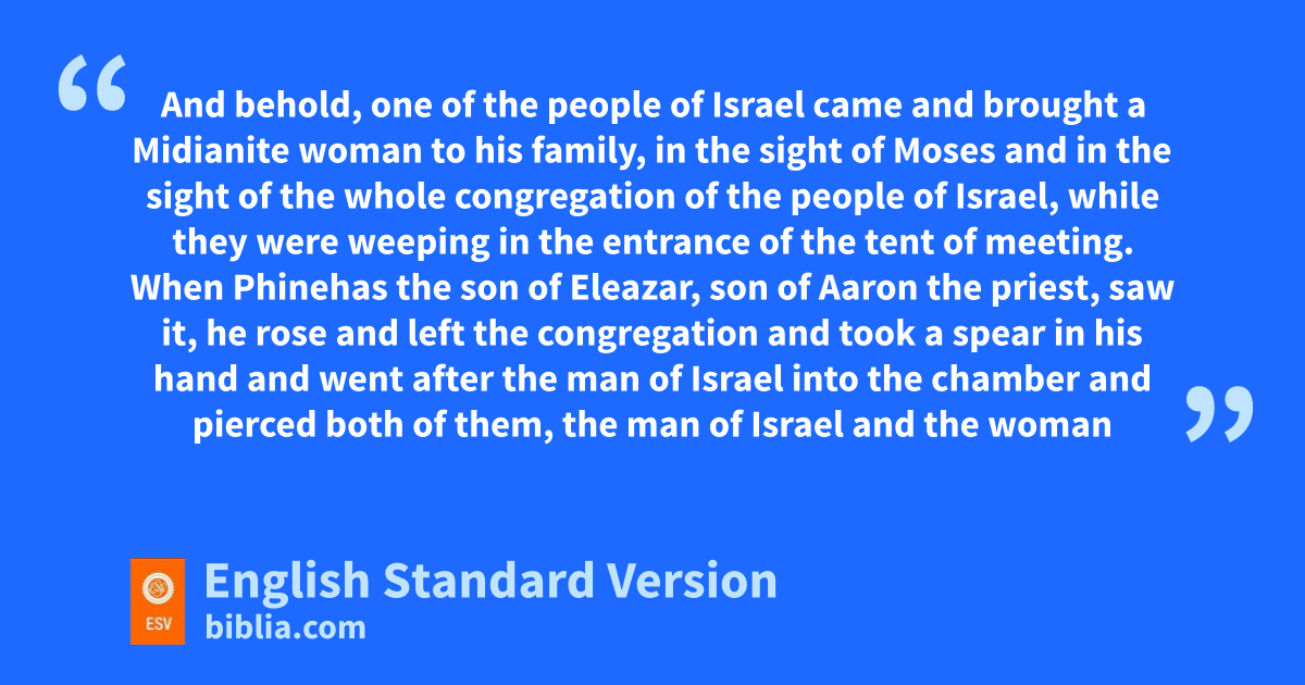 6 And behold, one of the people of Israel came and brought a Midianite woman to his family, in the sight of Moses and in the sight of the whole congregation of the people of Israel, while they were mweeping in the entrance of the tent of meeting. 7 nWhen Phinehas othe son of Eleazar, son of Aaron the priest, saw it, he rose and left the congregation and took a spear in his hand 8 and went after the man of Israel into the chamber and pierced both of them, the man of Israel and the woman through her belly. Thus the plague on the people of Israel was stopped. 9 Nevertheless, pthose who died by the plague were twenty-four thousand.