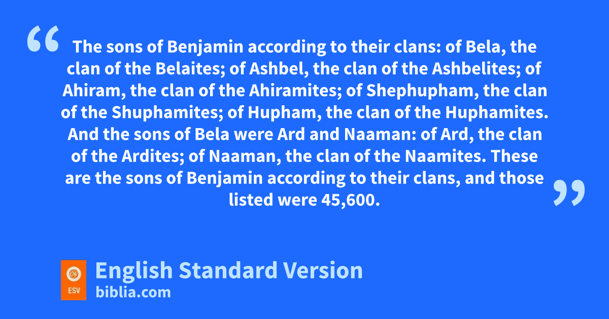 38 The sons of aBenjamin according to their clans: of Bela, the clan of the Belaites; of Ashbel, the clan of the Ashbelites; of Ahiram, the clan of the Ahiramites; 39 of Shephupham, the clan of the Shuphamites; of Hupham, the clan of the Huphamites. 40 And the sons of Bela were Ard and Naaman: of Ard, the clan of the Ardites; of Naaman, the clan of the Naamites. 41 These are the sons of Benjamin according to their clans, and those listed were b45,600.