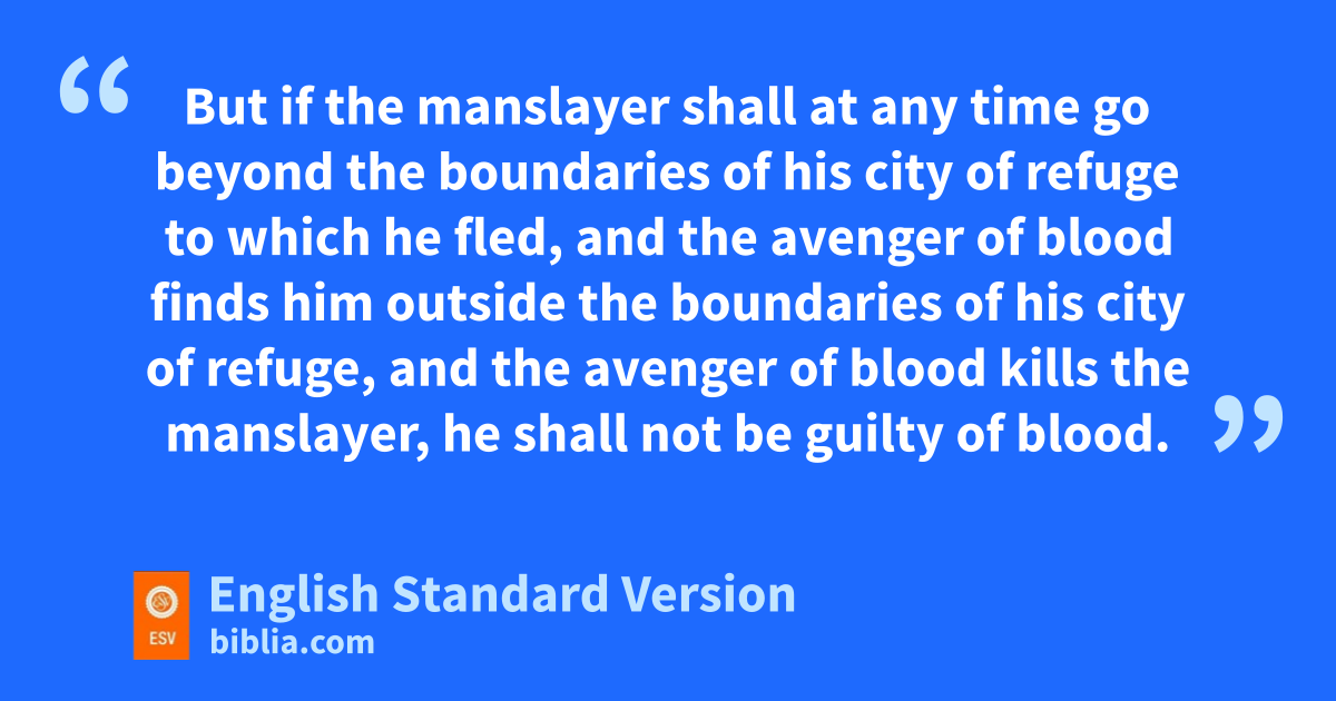 22 “But if he pushed him suddenly without enmity, or hurled anything on him gwithout lying in wait 23 or used a stone that could cause death, and without seeing him dropped it on him, so that he died, though he was not his enemy and did not seek his harm, 24 then hthe congregation shall judge between the manslayer and ethe avenger of blood, in accordance with these rules. 25 And the congregation shall rescue the manslayer from the hand of the avenger of blood, and the congregation shall restore him to his city of refuge to which he had fled, and he shall live in it iuntil the death of the high priest jwho was anointed with the holy oil. 26 But if the manslayer shall at any time go beyond the boundaries of his city of refuge to which he fled, 27 and ethe avenger of blood finds him outside the boundaries of his city of refuge, and the avenger of blood kills the manslayer, he shall not be guilty of blood. 28 For he must remain in his city of refuge iuntil the death of the high priest, but after the death of the high priest the manslayer may return to the land of his possession. 29 And these things shall be for ka statute and rule for you throughout your generations in all your dwelling places.