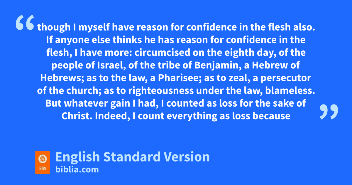 2 Look out for mthe dogs, look out for nthe evildoers, look out for those who mutilate the flesh. 3 For owe are the circumcision, pwho worship qby the Spirit of God2 and rglory in Christ Jesus and put no confidence in the flesh— 4 sthough I myself have reason for confidence in the flesh also. If anyone else thinks he has reason for confidence in the flesh, I have more: 5 tcircumcised on the eighth day, uof the people of Israel, vof the tribe of Benjamin, ua Hebrew of Hebrews; as to the law, wa Pharisee; 6 xas to zeal, ya persecutor of the church; zas to righteousness under the law,3 blameless. 7 But awhatever gain I had, bI counted as loss for the sake of Christ. 8 Indeed, I count everything as loss because of cthe surpassing worth of dknowing Christ Jesus my Lord. For his sake I ehave suffered the loss of all things and count them as rubbish, in order that I may gain Christ 9 and be found in him, not having fa righteousness of my own that comes from the law, but gthat which comes through faith in Christ, the righteousness from God that depends on faith— 10 hthat I may know him and ithe power of his resurrection, and jmay share his sufferings, becoming like him in his death, 11 that by any means possible I may kattain the resurrection from the dead.