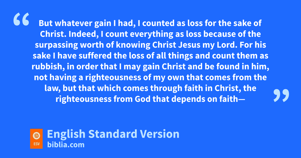2 Look out for mthe dogs, look out for nthe evildoers, look out for those who mutilate the flesh. 3 For owe are the circumcision, pwho worship qby the Spirit of God2 and rglory in Christ Jesus and put no confidence in the flesh— 4 sthough I myself have reason for confidence in the flesh also. If anyone else thinks he has reason for confidence in the flesh, I have more: 5 tcircumcised on the eighth day, uof the people of Israel, vof the tribe of Benjamin, ua Hebrew of Hebrews; as to the law, wa Pharisee; 6 xas to zeal, ya persecutor of the church; zas to righteousness under the law,3 blameless. 7 But awhatever gain I had, bI counted as loss for the sake of Christ. 8 Indeed, I count everything as loss because of cthe surpassing worth of dknowing Christ Jesus my Lord. For his sake I ehave suffered the loss of all things and count them as rubbish, in order that I may gain Christ 9 and be found in him, not having fa righteousness of my own that comes from the law, but gthat which comes through faith in Christ, the righteousness from God that depends on faith— 10 hthat I may know him and ithe power of his resurrection, and jmay share his sufferings, becoming like him in his death, 11 that by any means possible I may kattain the resurrection from the dead.