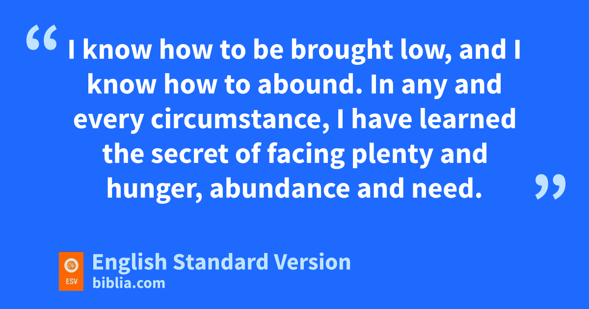 10 I rejoiced in the Lord greatly that now at length zyou have revived your concern for me. You were indeed concerned for me, but you had no opportunity. 11 Not that I am speaking of being in need, for I have learned, in whatever situation I am, to be acontent. 12 I know how to be brought low, and I know how to abound. In any and every circumstance, I have learned the secret of facing plenty and bhunger, abundance and cneed. 13 I can do all things dthrough him who strengthens me.