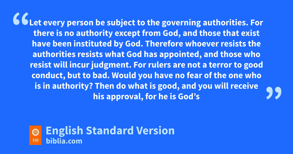 13 Let every person pbe subject to the governing authorities. For qthere is no authority except from God, and those that exist have been instituted by God. 2 Therefore whoever resists the authorities resists what God has appointed, and those who resist will incur judgment. 3 For rulers are not a terror to good conduct, but to bad. Would you have no fear of the one who is in authority? Then do what is good, and you rwill receive his approval, 4 for she is God’s servant for your good. But if you do wrong, be afraid, for he does not bear the sword in vain. For he is the servant of God, tan avenger who carries out God’s wrath on the wrongdoer. 5 Therefore one must be in subjection, not only to avoid God’s wrath but also ufor the sake of conscience. 6 For because of this you also pay taxes, for the authorities are ministers of God, attending to this very thing. 7 vPay to all what is owed to them: taxes to whom taxes are owed, revenue to whom revenue is owed, respect to whom respect is owed, honor to whom honor is owed.