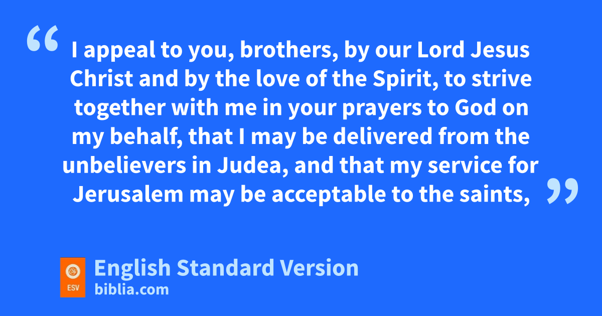 30 I appeal to you, brothers, by our Lord Jesus Christ and by jthe love of the Spirit, kto strive together with me in your prayers to God on my behalf, 31 lthat I may be delivered from the unbelievers in Judea, and that mmy service for Jerusalem may be acceptable to the saints, 32 so that by God’s will I may come to you with joy and nbe refreshed in your company. 33 May othe God of peace be with you all. Amen.