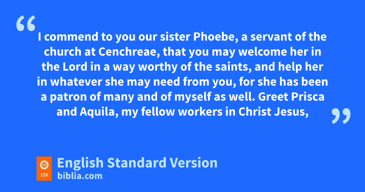 16 I commend to you our sister Phoebe, a servant1 of the church at pCenchreae, 2 that you qmay welcome her in the Lord in a way worthy of the saints, and help her in whatever she may need from you, for she has been a patron of many and of myself as well.
