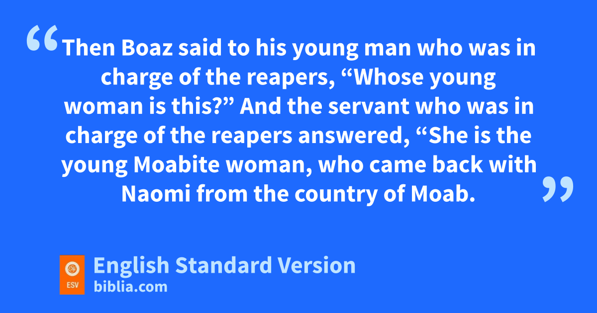 2 Now Naomi had ta relative of her husband’s, a worthy man of the clan of Elimelech, whose name was uBoaz. 2 And Ruth the Moabite said to Naomi, “Let me go to the field and vglean among the ears of grain after him win whose sight I shall find favor.” And she said to her, “Go, my daughter.” 3 So she set out and went and gleaned in the field after the reapers, and she happened to come to the part of the field belonging to Boaz, who was of the clan of Elimelech. 4 And behold, Boaz came from Bethlehem. And he said to the reapers, x“The Lord be with you!” And they answered, “The Lord bless you.” 5 Then Boaz said to his young man who was in charge of the reapers, “Whose young woman is this?” 6 And the servant who was in charge of the reapers answered, “She is the young Moabite woman, ywho came back with Naomi from the country of Moab. 7 She said, ‘Please let me glean and gather among the sheaves after the reapers.’ So she came, and she has continued from early morning until now, except for a short rest.”1