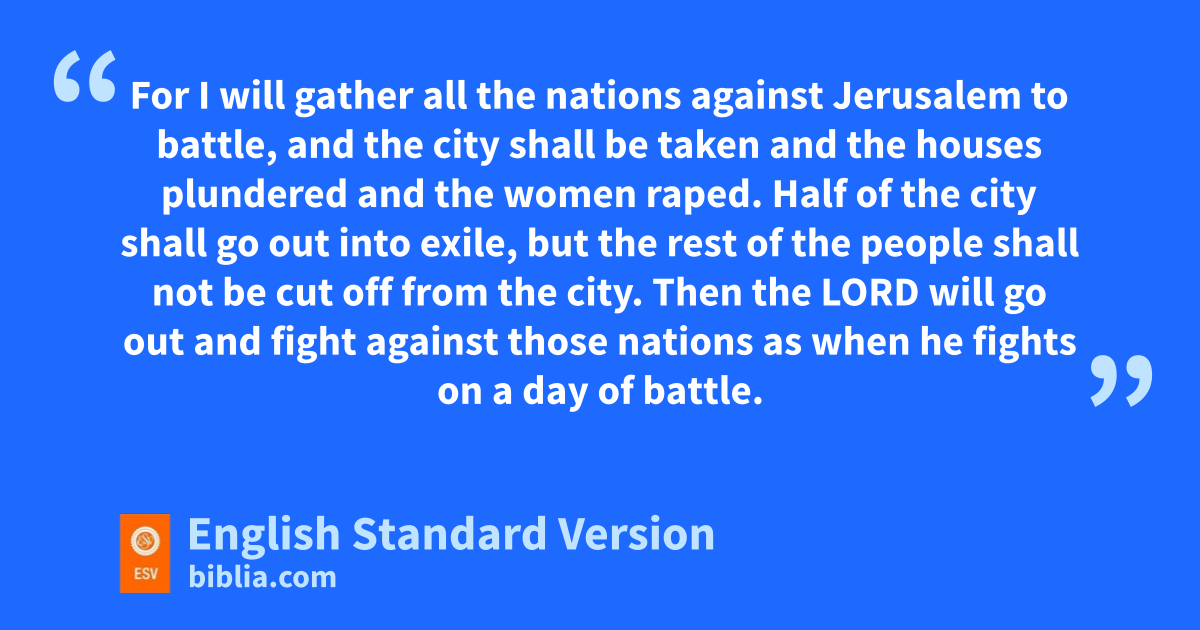 14 Behold, xa day is coming for the Lord, when the spoil taken from you will be divided in your midst. 2 For yI will gather all the nations against Jerusalem to battle, and zthe city shall be taken aand the houses plundered band the women raped. cHalf of the city shall go out into exile, but the rest of the people shall not be cut off from the city. 3 dThen the Lord will go out and fight against those nations as when he fights on a day of battle. 4 eOn that day his feet shall stand fon gthe Mount of Olives that lies before Jerusalem on the east, and gthe Mount of Olives shall be split in two from east to west by ha very wide valley, so that one half of the Mount shall move northward, and the other half southward. 5 And you shall flee to the valley of my mountains, for the valley of the mountains shall reach to Azal. And you shall flee as you fled from ithe earthquake in the days of Uzziah king of Judah. Then the Lord my God will come, and all the holy ones with him.1