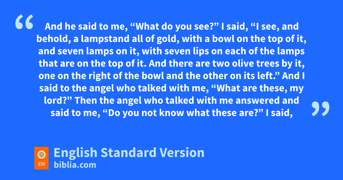 4 And fthe angel who talked with me came again gand woke me, like a man who is awakened out of his sleep. 2 And he said to me, “What do you see?” I said, “I see, and behold, ha lampstand all of gold, with a bowl on the top of it, and iseven lamps on it, with seven lips on each of the lamps that are on the top of it. 3 And there are jtwo olive trees by it, one on the right of the bowl and the other on its left.” 4 And I said to fthe angel who talked with me, “What are these, my lord?” 5 Then the angel who talked with me answered and said to me, k“Do you not know what these are?” I said, “No, my lord.” 6 Then he said to me, “This is the word of the Lord to lZerubbabel: mNot by might, nor by power, but by my Spirit, says the Lord of hosts. 7 Who are you, nO great mountain? Before lZerubbabel oyou shall become a plain. And he shall bring forward pthe top stone amid shouts of ‘Grace, grace to it!’ ”